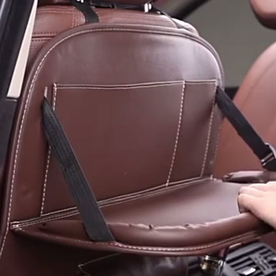Multifunctional Car Seat Back Organizer – with multiple compartments for bottles, tissue box, phone, tablet, umbrella, trash bag, and more. Keep your car neat and organized.